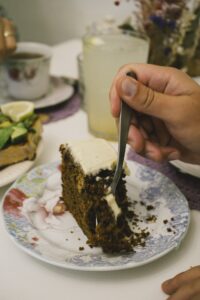 A modo de postre, una tarta de alcayota y nuez rellena de suave crema de queso.